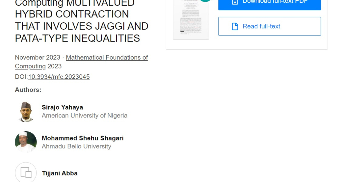 A recent study led by AUN's Professor of Mathematics, Dr. Sirajo Yahaya, in the Department of Mathematics and Statistics of the School of Arts and Sciences, has been published in the American Institute of Mathematical Sciences journal. Prof. Sirajo Yahaya, Mohammed Shehu Shagari, and Tijani Abba Ali collaborated in the study "Multivalued Hybrid Contraction That Involves Jaggi and Pata-Type Inequalities," published in November 2023.